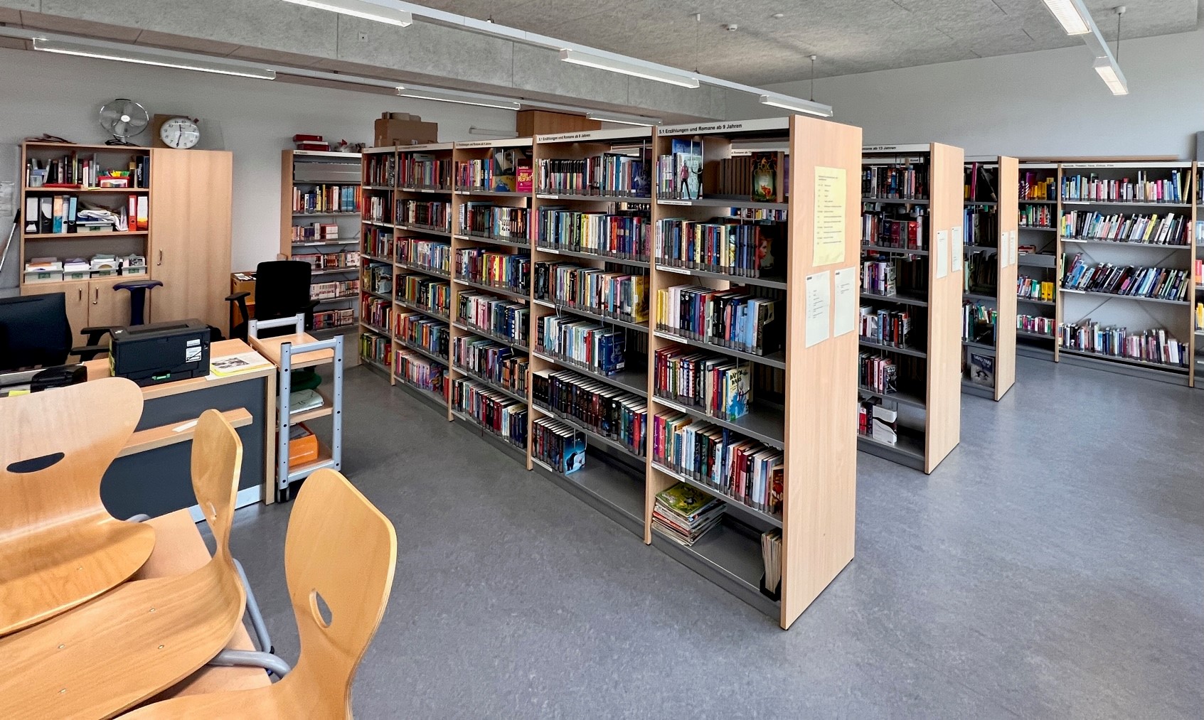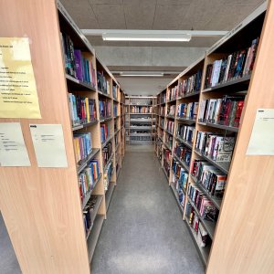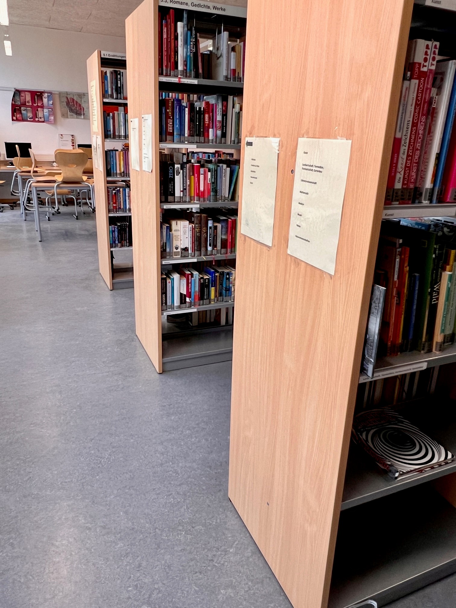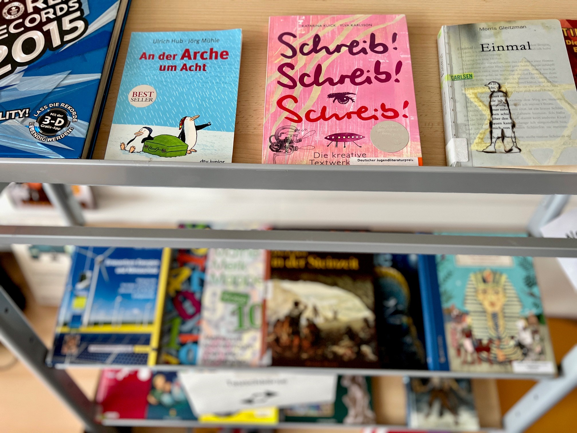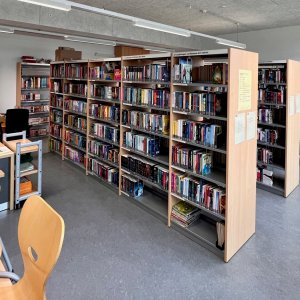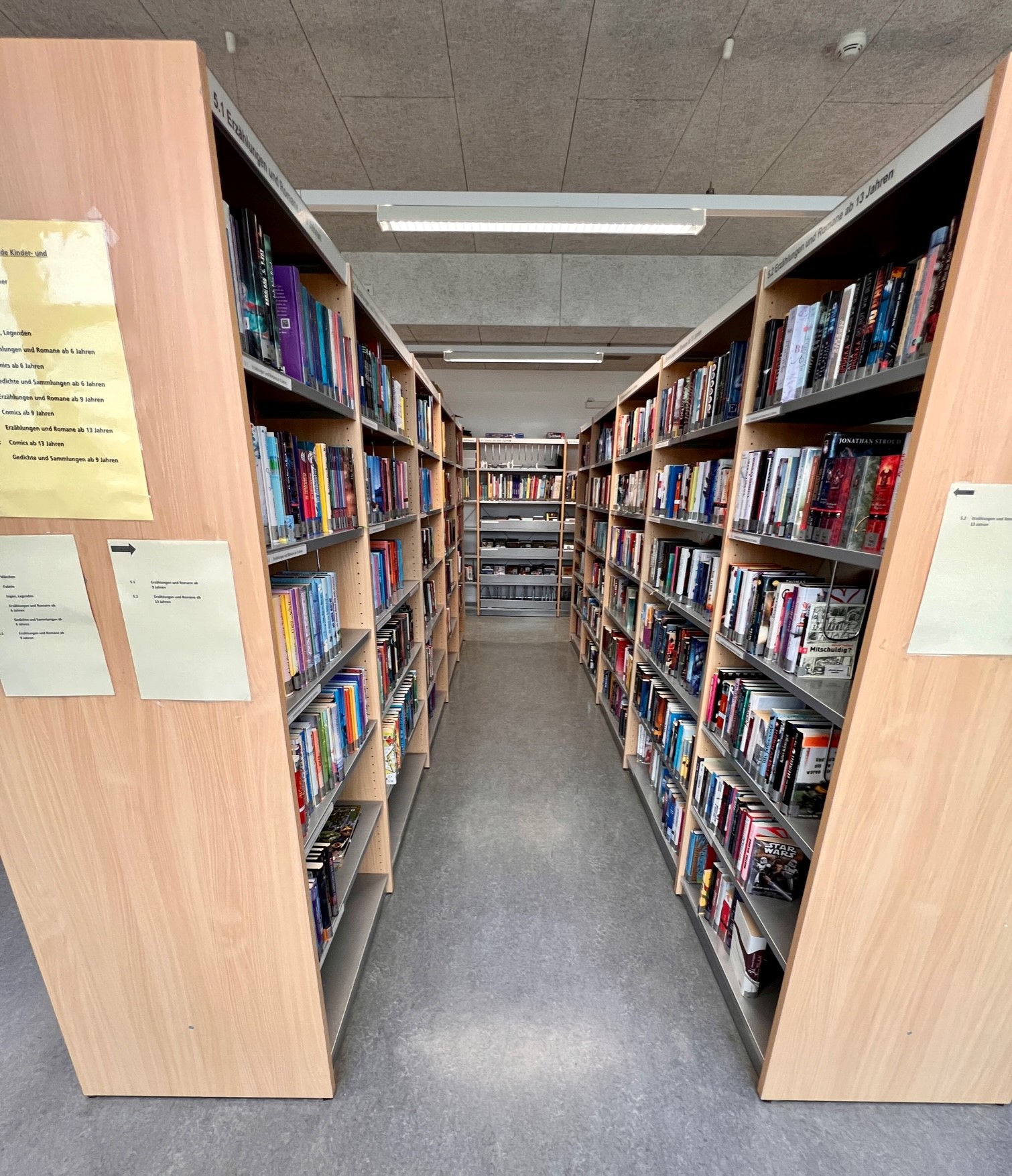 Wir haben aktuell schätzungsweise um die 10.000 Bücher und 1.000 Filme und Spiele. Das Sortierungssystem ist das gleiche wie in der Stadtbücherei. In den vorderen Regalen stehen die Fantasy-Bücher ab neun Jahren. Man erkennt sie an der Zahl 5.1, die unten am Buchrücken steht. In den zwei Regalen danach kommen die Fantasy-Bücher für Ältere. Diese haben die Zahl 5.2 am unteren Buchrücken stehen. In den restlichen Regalen dahinter stehen die Sachbücher. Also Geschichte, Naturwissenschaft, Hauswirtschaft, Mathe usw. Zusätzlich stehen an der Seite des Raumes die Mangas und Animes.