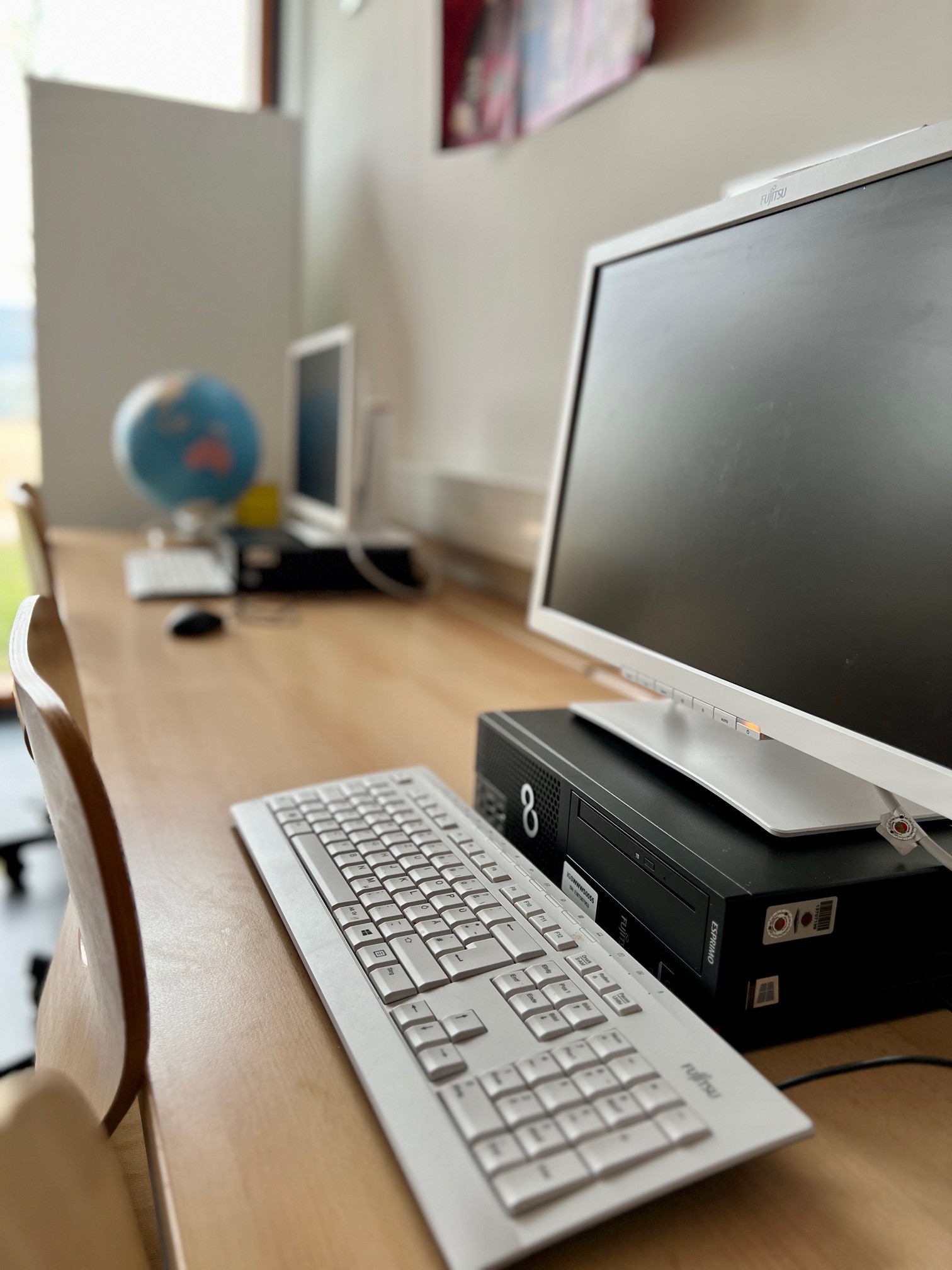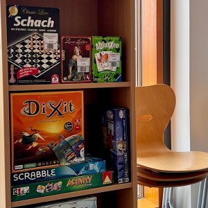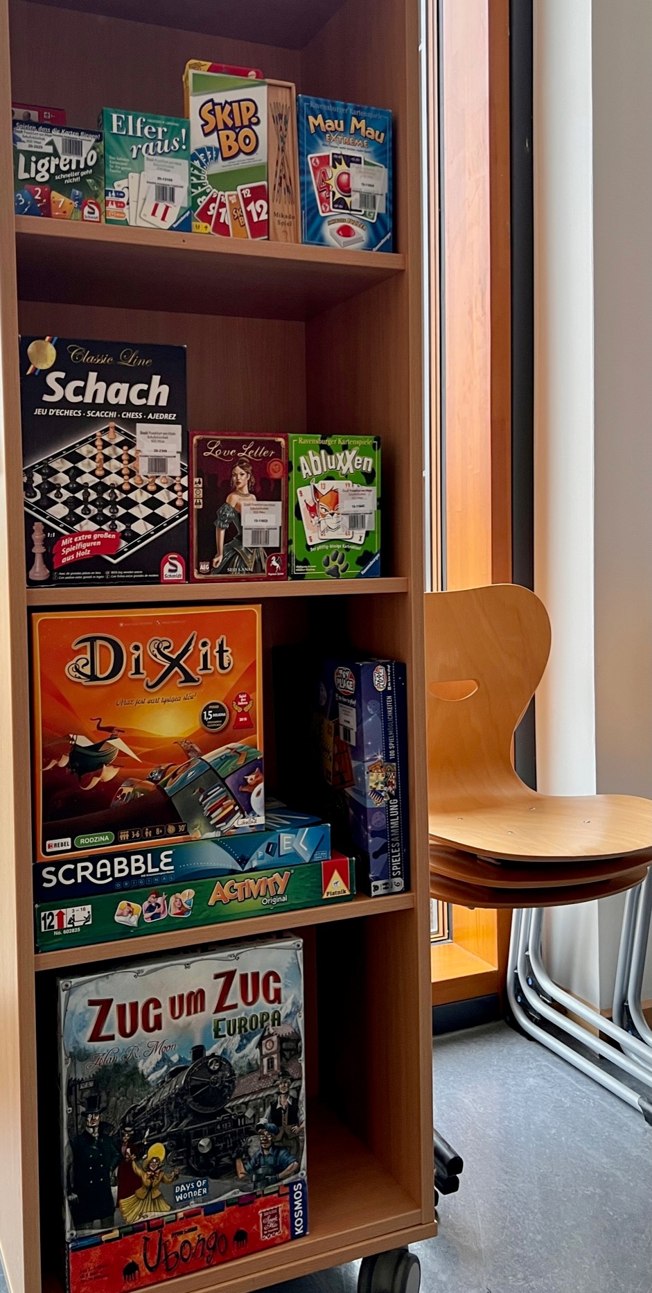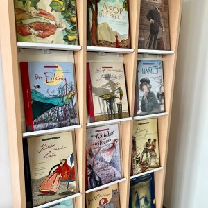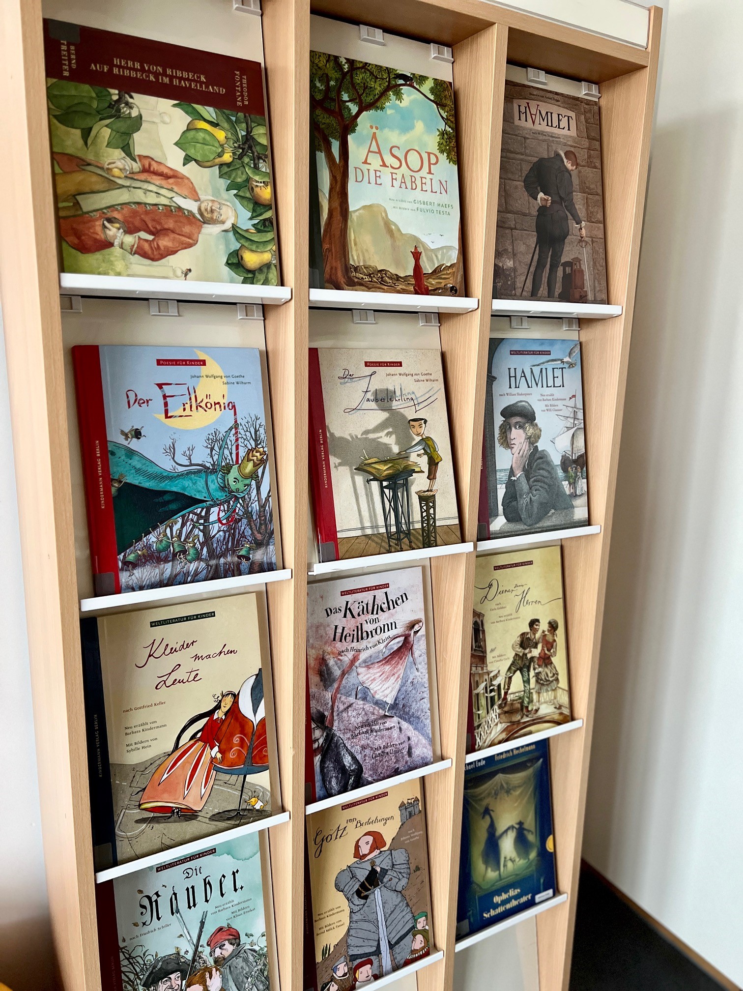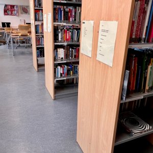 Wir haben aktuell schätzungsweise um die 10.000 Bücher und 1.000 Filme und Spiele. Das Sortierungssystem ist das gleiche wie in der Stadtbücherei. In den vorderen Regalen stehen die Fantasy-Bücher ab neun Jahren. Man erkennt sie an der Zahl 5.1, die unten am Buchrücken steht. In den zwei Regalen danach kommen die Fantasy-Bücher für Ältere. Diese haben die Zahl 5.2 am unteren Buchrücken stehen. In den restlichen Regalen dahinter stehen die Sachbücher. Also Geschichte, Naturwissenschaft, Hauswirtschaft, Mathe usw. Zusätzlich stehen an der Seite des Raumes die Mangas und Animes.