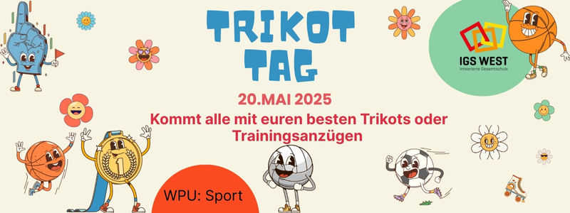 Der Trikot-Tag an der IGS West ist ein besonderer Tag, an dem Schülerinnen und Schüler ihre Lieblingssporttrikots tragen. Es ist eine tolle Gelegenheit, Teamgeist zu zeigen und gemeinsam Spaß zu haben. Viele freuen sich schon darauf, ihre Lieblingsmannschaften zu unterstützen und den Tag in einer sportlichen Atmosphäre zu verbringen. Der Trikot-Tag fördert den Zusammenhalt und macht die Schule noch lebendiger!