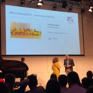 Und nicht nur das: In Kategorie „Digitaler Medienpreis“ hat unser Jahrgang sogar den 1. Platz mit unserem Film „Höchst motiviert“ bekommen. Hier haben wir gezeigt, dass wir auch nachhaltig sein können. Wir haben aus Zeitungen Kostüme im Fach Ästhetischer Bildung gebastelt und haben viele weitere verrückte Sachen aus Zeitungen erstellt und dem I-Pad gefilmt. Es ist ein toller Film geworden!