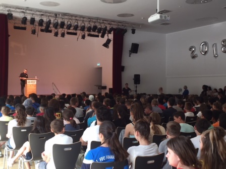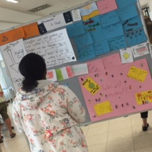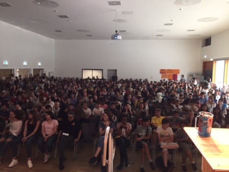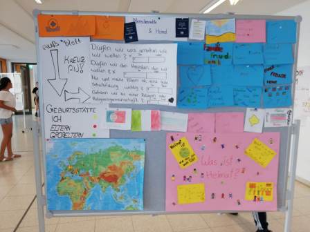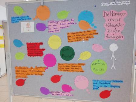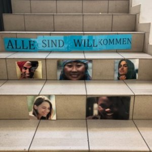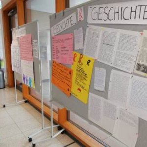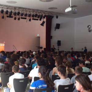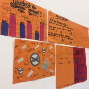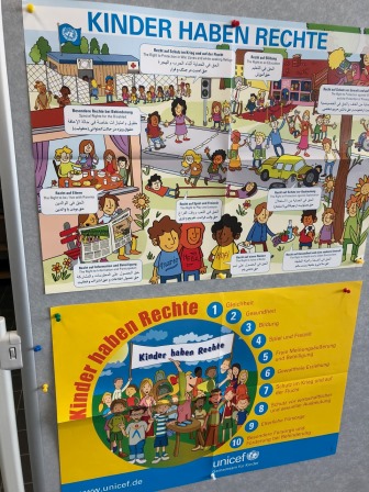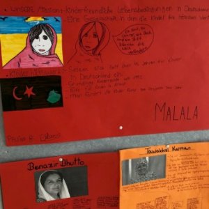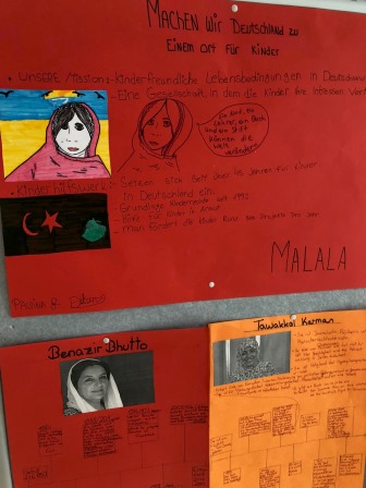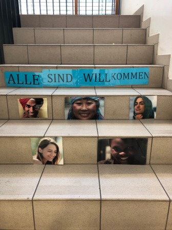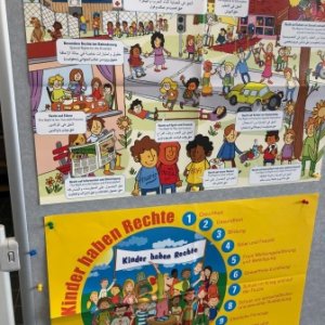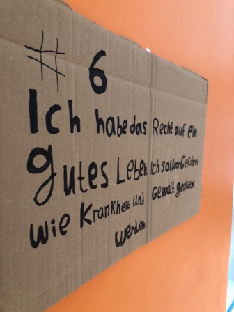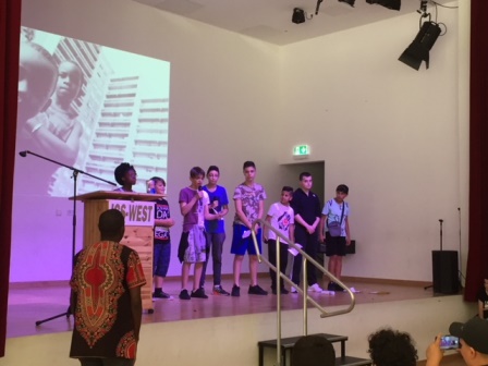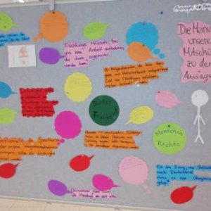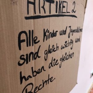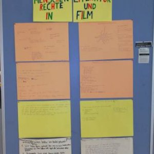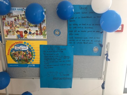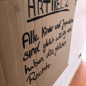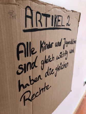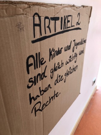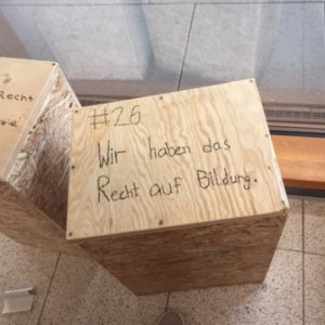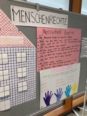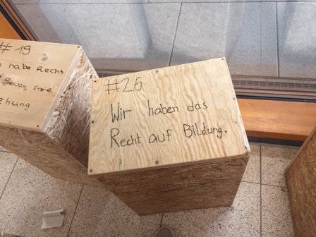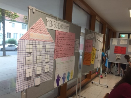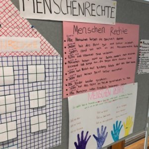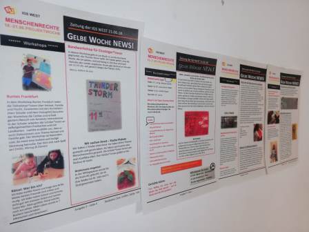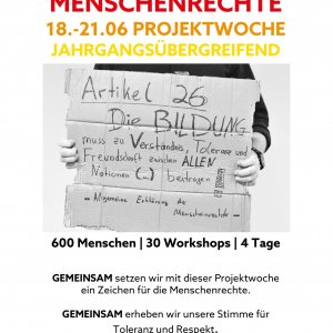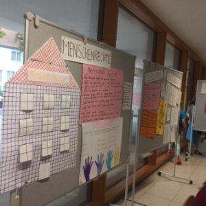 Der Lernort Schule hat sich für externe Angebote geöffnet und innerhalb der Schule wurden die Klassen und Jahrgänge kräftig durcheinander gemischt. In neuen, altersgemischten Gruppen fanden so über 28 Workshops für 500 Schüler*innen statt. Alle Lehrkräfte boten Workshops zum Thema „Menschenrechte“ an. Unter der federführenden organisatorischen Leitung der Jugendhilfe (Caritasverband Frankfurt e.V.) wurde: die WM unter die Lupe genommen, Malala kennengelernt, mit Matondo gerappt, mit der Jugendkoordination der Polizei couragiert eingegriffen, genäht, fotografiert, über sexuelle Selbstbestimmung debattiert, Sitzgelegenheiten für den Dialog gebaut, durchgepowert für Respekt mit Jugendhilfe Respekt Training, Essen für die Unicef-Spendenaktion gekocht und verkauft, Kunstproteste organisiert und und und....