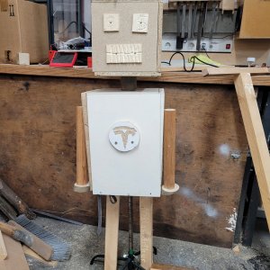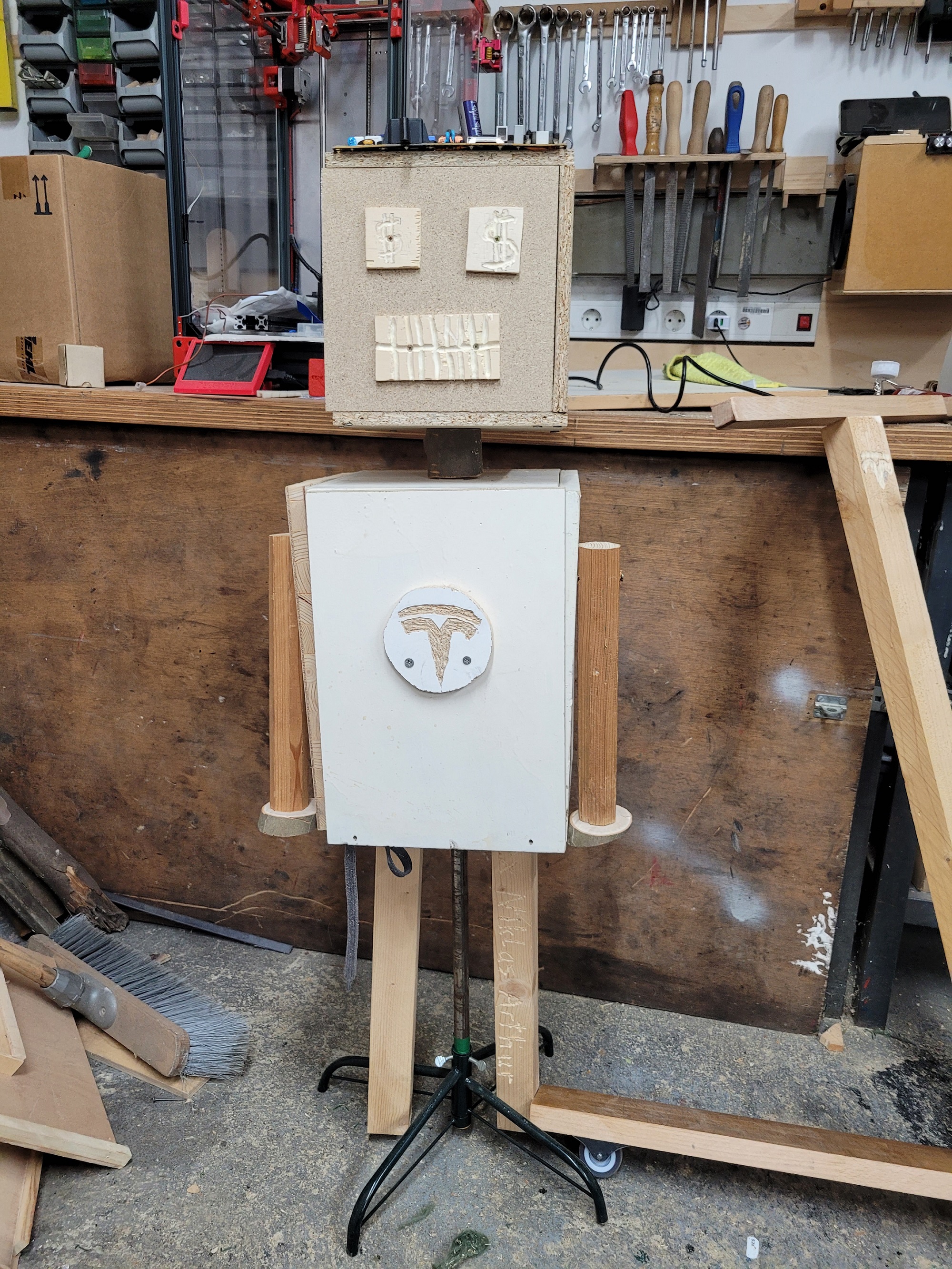 Meine Gruppe und ich haben einen Roboter gebaut. Der Roboter bestand aus zwei Beinen, die aus Holz waren, darüber war der Oberkörper, der aus sechs Holzplatten bestand. An dem Oberkörper waren noch zwei Arme aus Holz befestigt und als Kopf haben wir wieder sechs gleich große Holzplatten benutzt und darauf das Gesicht gefräst. Dann haben wir noch ein paar Details hinzugefügt, wie Haare, die aus einer Platine bestehen und ein kleines Tesla-Logo auf die Mitte des Bauches.