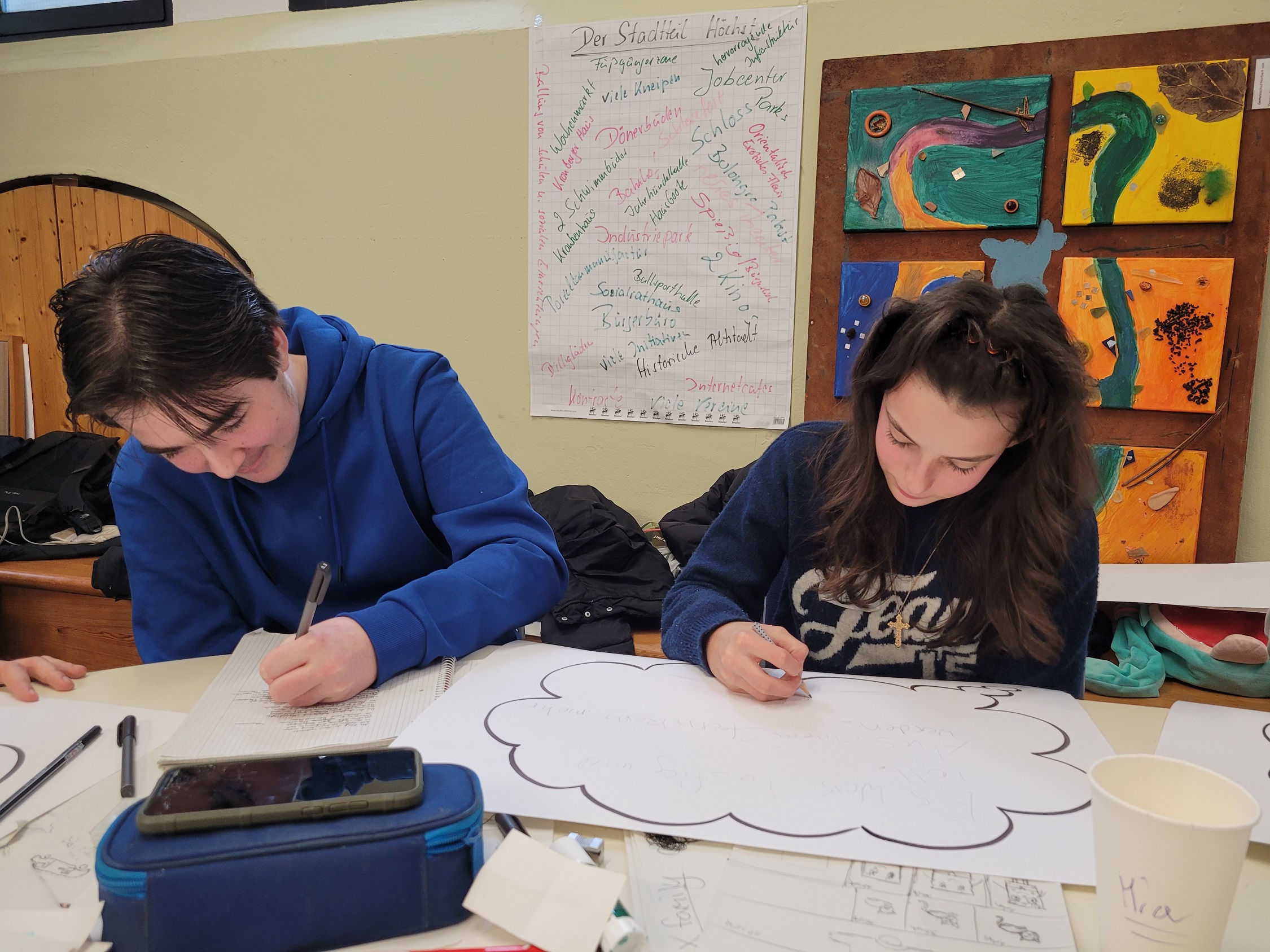 In der Woche vom 13.01.-17.01.2025 hat die Klasse 8a am Kunstprojekt “Höchst Kreativ” teilgenommen, das in Zusammenarbeit mit dem JuKuZ Höchst und der ‚University of Applied Sciences‘ durchgeführt wurde. In dieser Woche haben die Schüler und Schülerinnen nach einem gemeinsamen Frühstück an ganz verschiedenen Workshops teilgenommen, die von den Studenten und Studentinnen organisiert, geplant und durchgeführt wurden. Comics zeichnen, aus gefundenen Sachen etwas Zusammenbauen, alte Kleider wieder brauchbar machen, ein Rap-Song im Studio aufnehmen und ein Video dazu drehen und viele andere Projekte waren dabei. Die Ergebnisse wurden am Freitagnachmittag Schülern und Schülerinnen, Eltern, Lehrkräften und allen anderen Interessierten präsentiert.