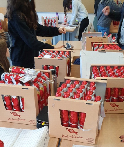 Am 06.12.2021 hat sich der WPU-Kurs im ersten Block in zwei Gruppen aufgeteilt und in Begleitung von Weihnachtsmusik die Nikoläuse in allen Klassen verteilt. Dabei erhielten 370 Nikoläuse ihre Besitzer!