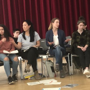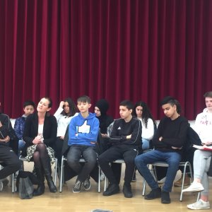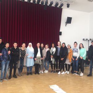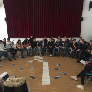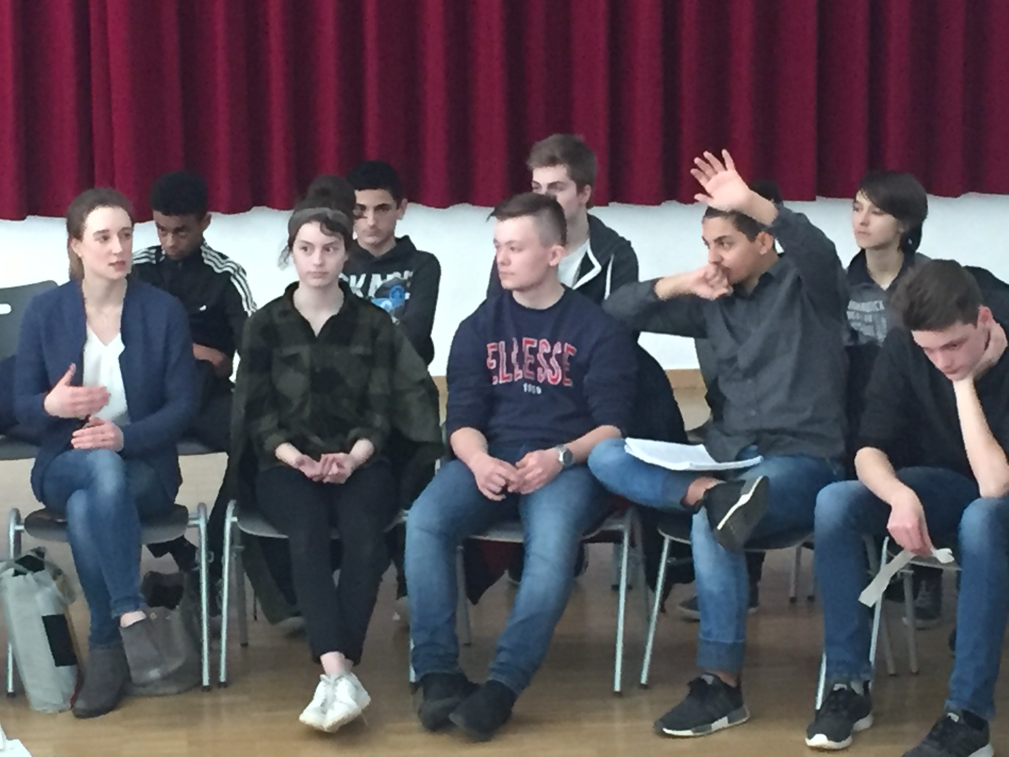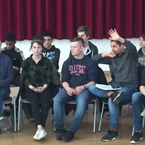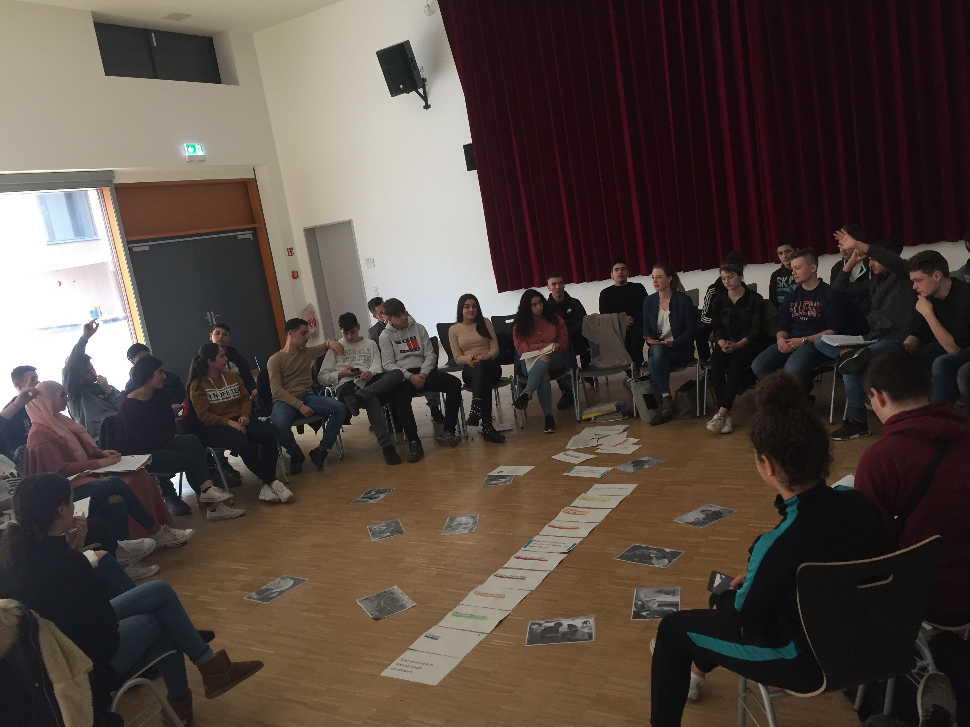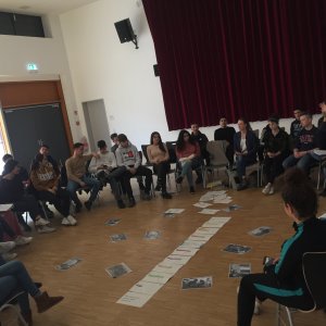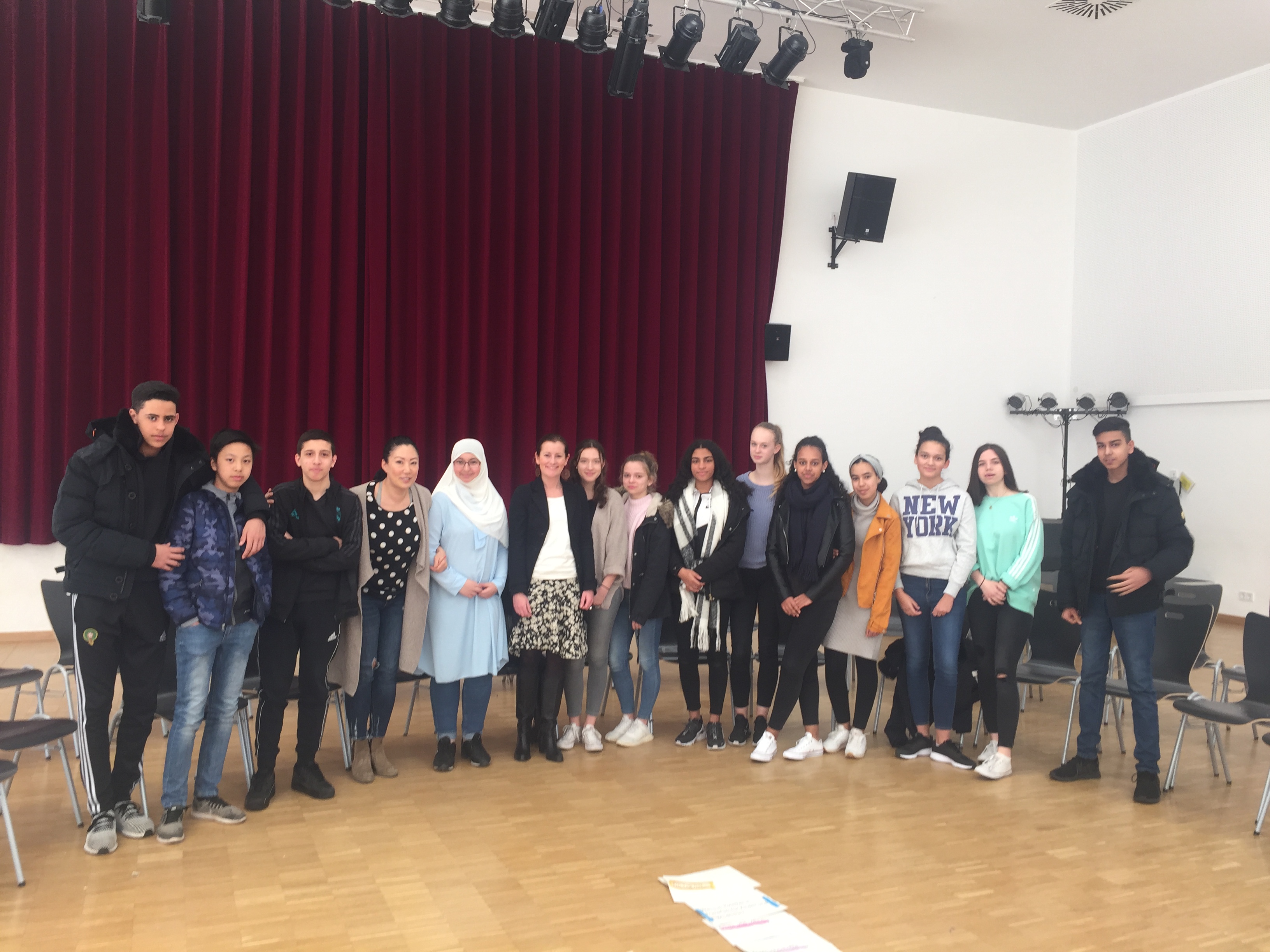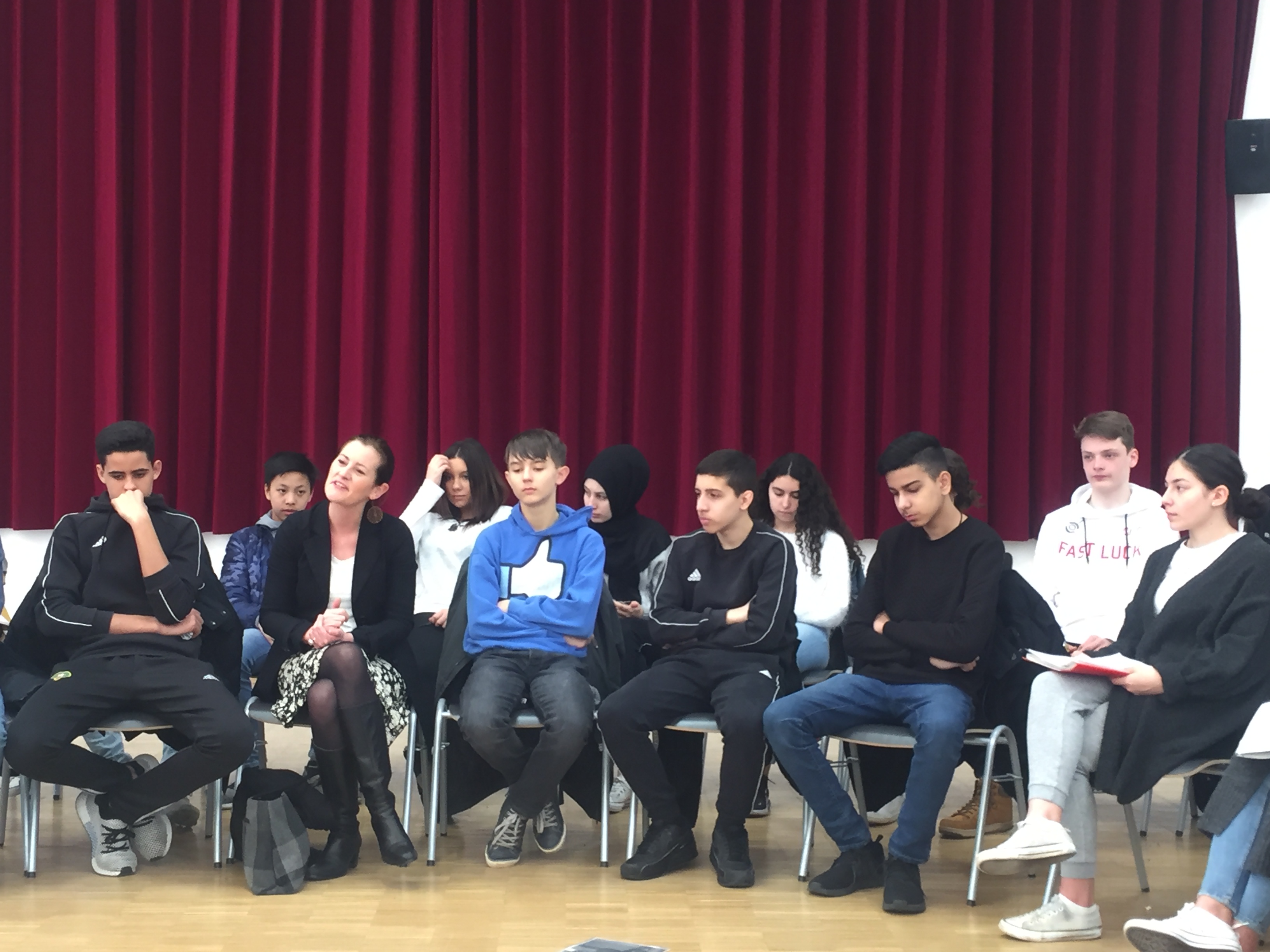 Die Klassen und weitere Interessierte aus dem 9. Jahrgang haben sich jeweils an den beiden Tagen mit großem Interesse in der Aula versammelt. Ganz am Anfang des Interviews haben sich die Personen vorgestellt und erzählt, was sie beruflich machen. Dann wurden allgemeine Fragen gestellt, wie z. B. "Wie sieht ihr Alltag aus?".