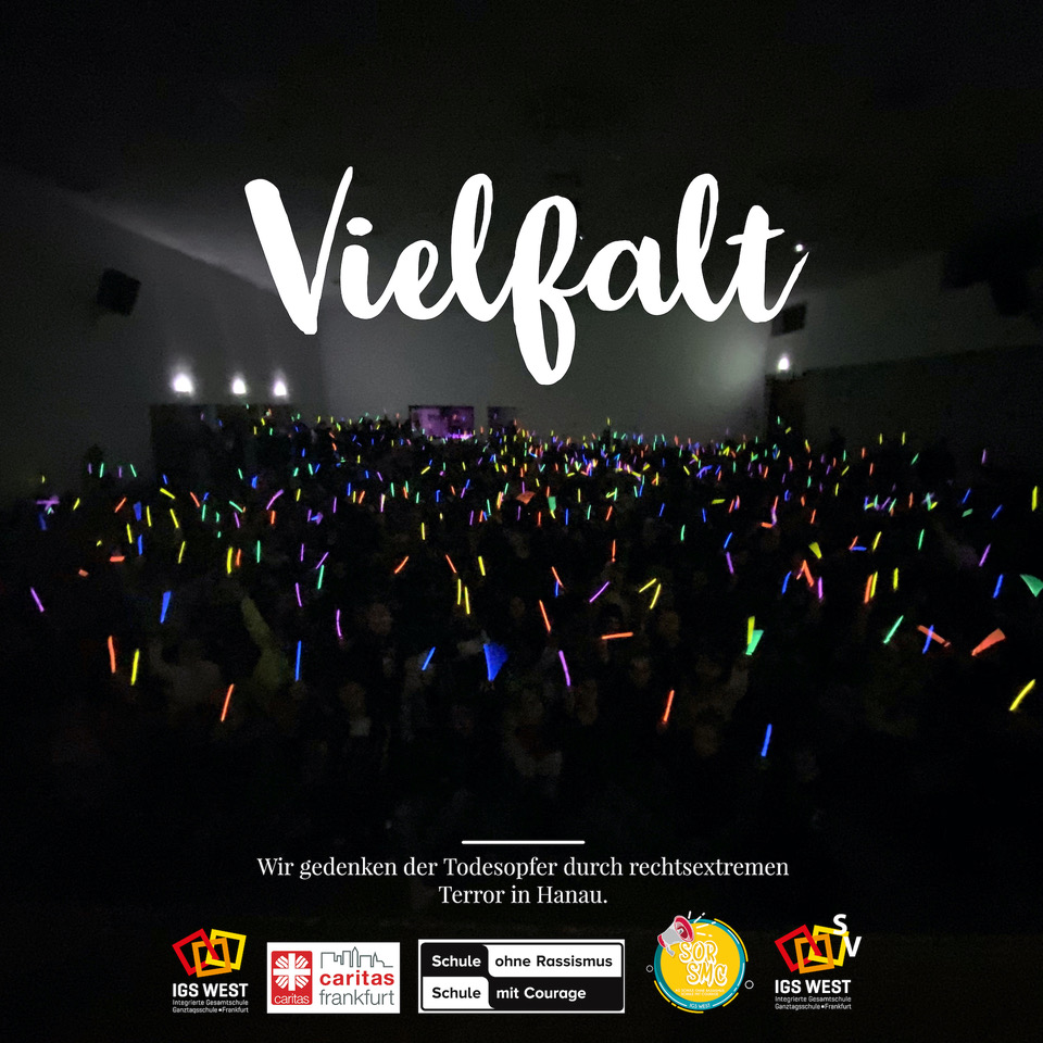 Wir wollten eine Schul-Aktion, um den Opfern in Hanau zu gedenken. Das Thema soll nicht nur durch eine Schweigeminute abgehakt werden. Uns war es wichtig, ein Zeichen zu setzen. Auf der einen Seite soll es der Trauer gerecht werden, auf der anderen Seite aber auch die bunte Vielfalt unserer Schule und Lebensweise wiedergeben. Unsere Schule steht für Schule ohne Rassismus - Schule mit Courage und das möchten wir repräsentieren. Für die Aktion haben wir alle 600 Schüler*innen in die Aula eingeladen. Nach einer kurzen Hintergrund-Präsentation zu den Vorfällen wurden 600 Knicklichter ausgeteilt. Zunächst wurde der Raum verdunkelt und alle sollten die Knicklichter nach oben halten. Das dabei entstandene Foto präsentieren wir hier, mit unserer Nachricht nach Hanau und in die Welt: