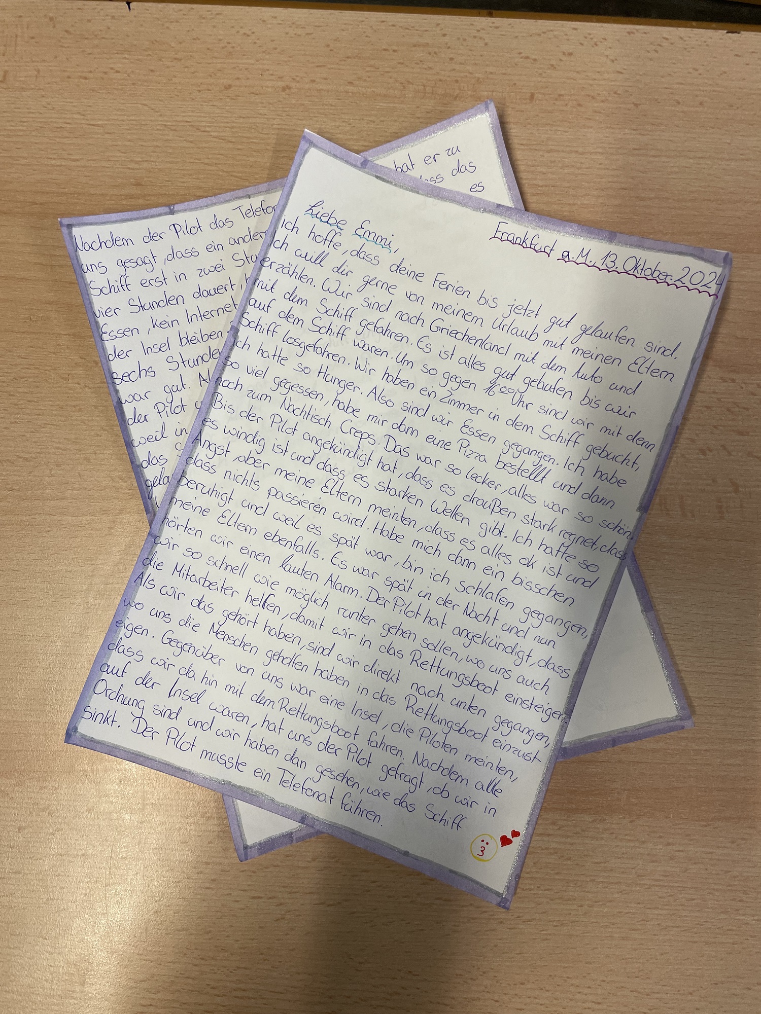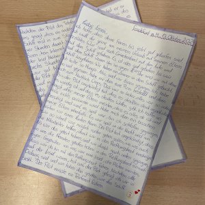 Am 15.11.2024 hat unsere Klasse, die 7c,beim diesjährigen Schülerschreibwettbewerb zum Tag der Handschrift teilgenommen. Aufgabe des Wettbewerbs war es, einen Brief zum Thema "Abenteuer" an eine beliebige Adressatin oder einen beliebigen Adressaten zu schreiben. Der Phantasie waren dabei keine Grenzen gesetzt - weder was den Inhalt betraf noch an wen oder was sich der Brief gerichtet hat. Dabei herausgekommen sind tolle Briefe mit spannenden Abenteuern in wunderschönen Handschriften verfasst!