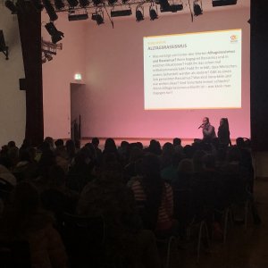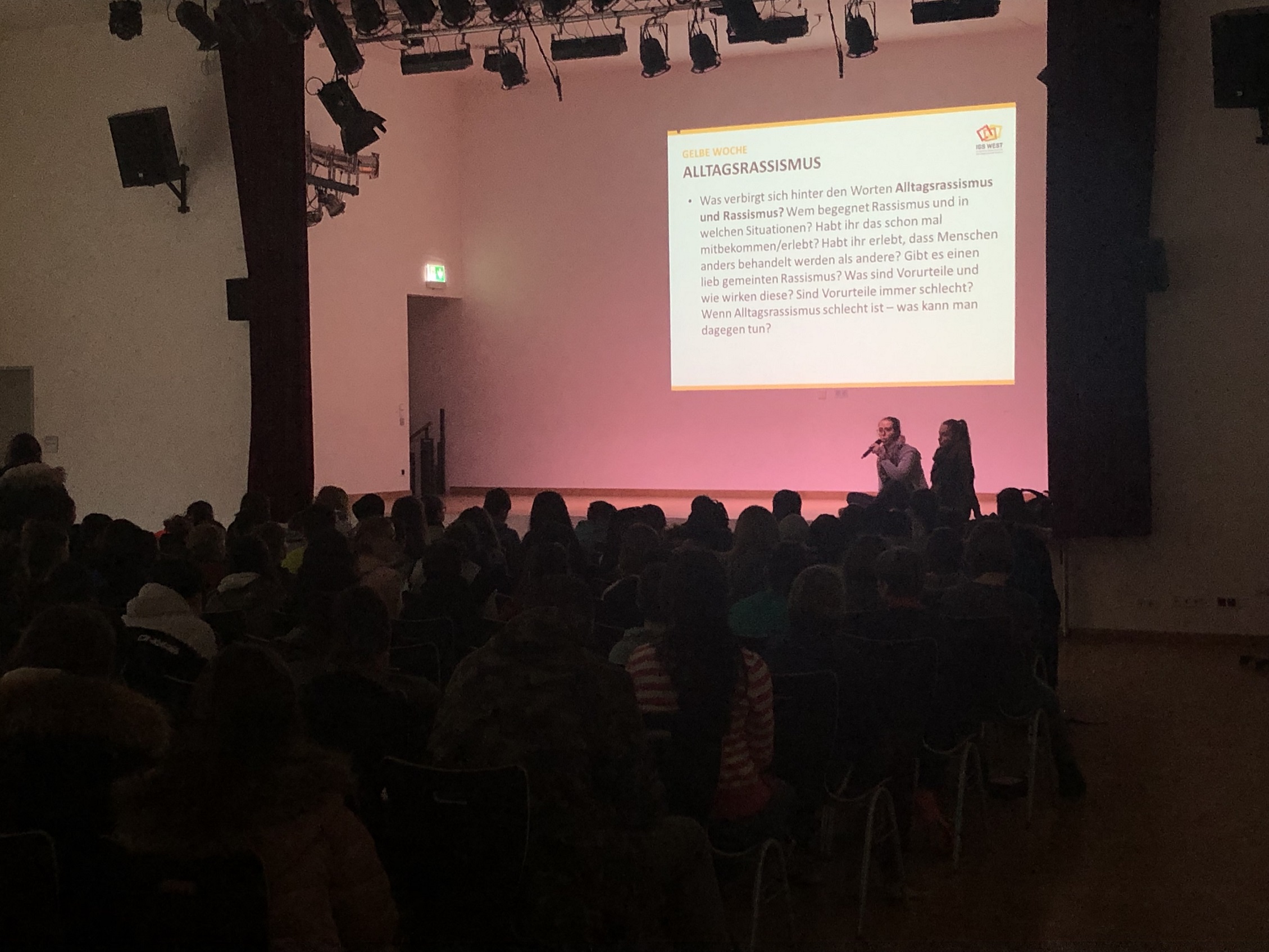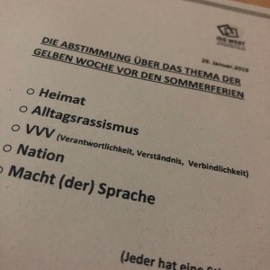 Am 29.01.19 habe alle Schüler*innen der IGS West über das neue Thema der Projektwoche abgestimmt. Als Netzwerkschule „Schule ohne Rassismus, Schule mit Courage“ wird einmal jährlich eine Projektwoche mit dem Themenschwerpunkt durchgeführt. Um das Motto der Woche genauer zu definieren durften alle Menschen der Schule Themenvorschläge abgeben. Daran haben sich einzelne Lehrkräfte, die SV, die Jugendhilfe und die AG Schule ohne Rassismus - Schule mit Courage beteiligt. Die Arbeitsgruppe für die Projektwoche und die SV haben anschließend die Themen gebündelt und 5 Vorschläge für die Wahl ausgesucht. Am 29.01.19 wurden immer zwei Jahrgänge in die Aula eingeladen und die Themen wurden auf der Bühne per Präsentation erläutert. Im Anschluss fand die Wahl statt.