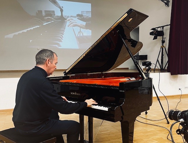 Die älteren Schülerinnen und Schüler sowie die Intensivklassen begaben sich auf eine Reise „von 0 auf 6b in 80 Minuten“ – entlang des Quintenzirkels durch drei Jahrhunderte Musikgeschichte. Der Pianist kombinierte Werke von Johann Sebastian Bach bis hin zu zeitgenössischen Stücken von Henry Martin und verband sie nahtlos mit Ragtime-Klassikern.