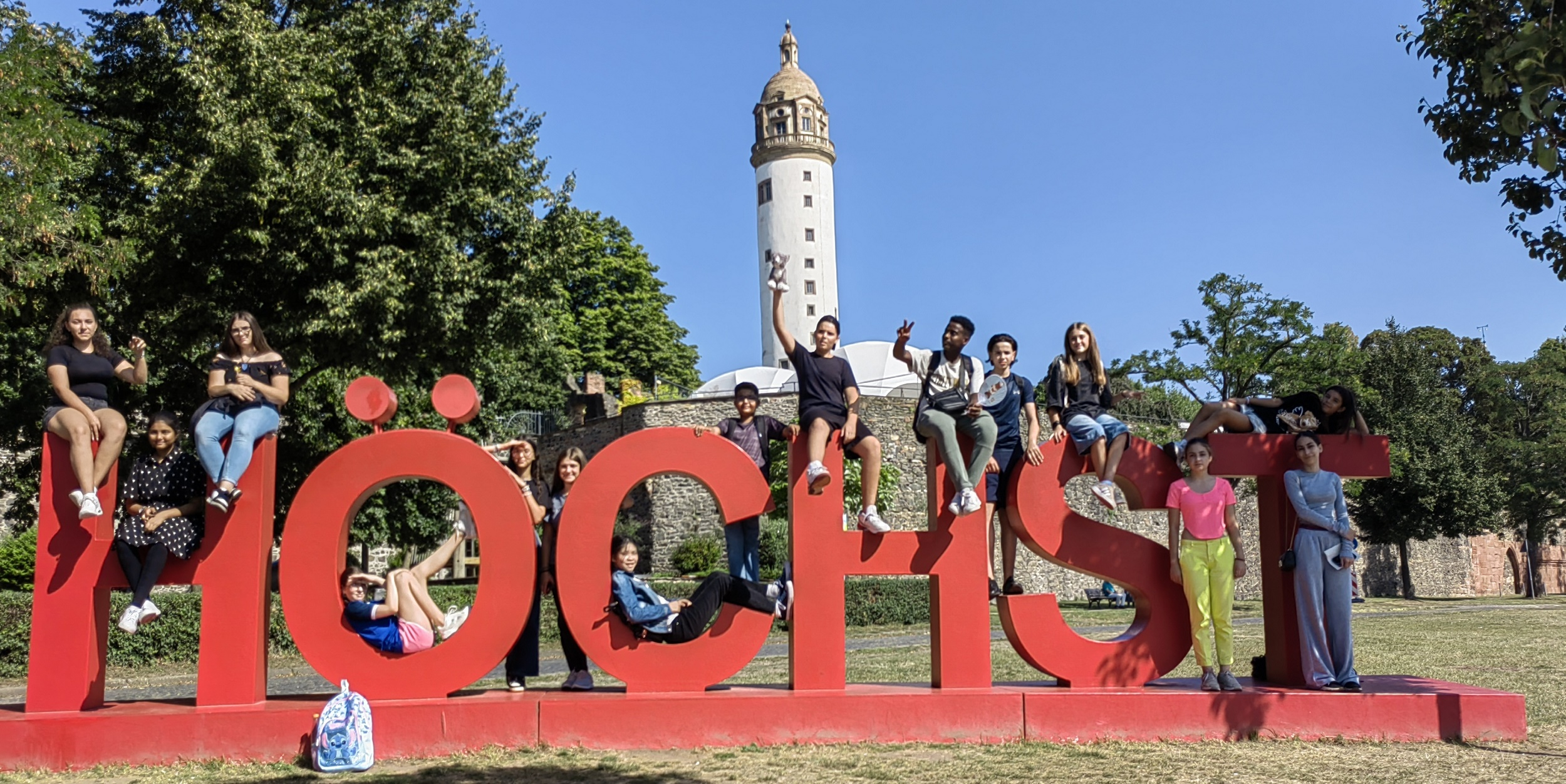 "Die Schülerinnen und Schüler der beiden Intensivklassen (IK) der IGS-West haben im Verlauf der Gelben Woche am Mittwoch, 28.08.2024, eine Schnitzeljagt gemacht. Ihr Weg führte sie dabei insgesamt an neun verschiede Orte zwischen der IGS-West und dem Mainufer. Mit Fragen, Antworten und in kurzen Gesprächen mit vielen sehr freundlichen und hilfsbereiten Passanten haben sie ihren Weg und alle Ziele in ihrem Stadtteil selbst gefunden. Und so ist ihnen Höchst als zweite Heimat wieder etwas vertrauter geworden."