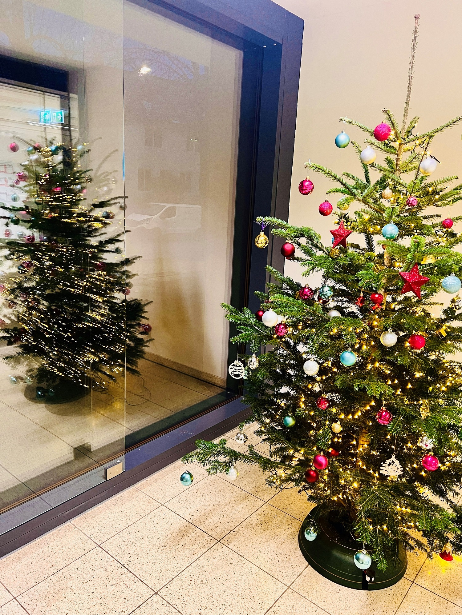 Er steht im Eingangsbereich der Schule. Und die Schülerinnen und Schüler der Bastel AG haben zusammen mit Frau Guvernator, den Baum mit viel Liebe und ihrer Kreativtät zum Leuchten gebracht.