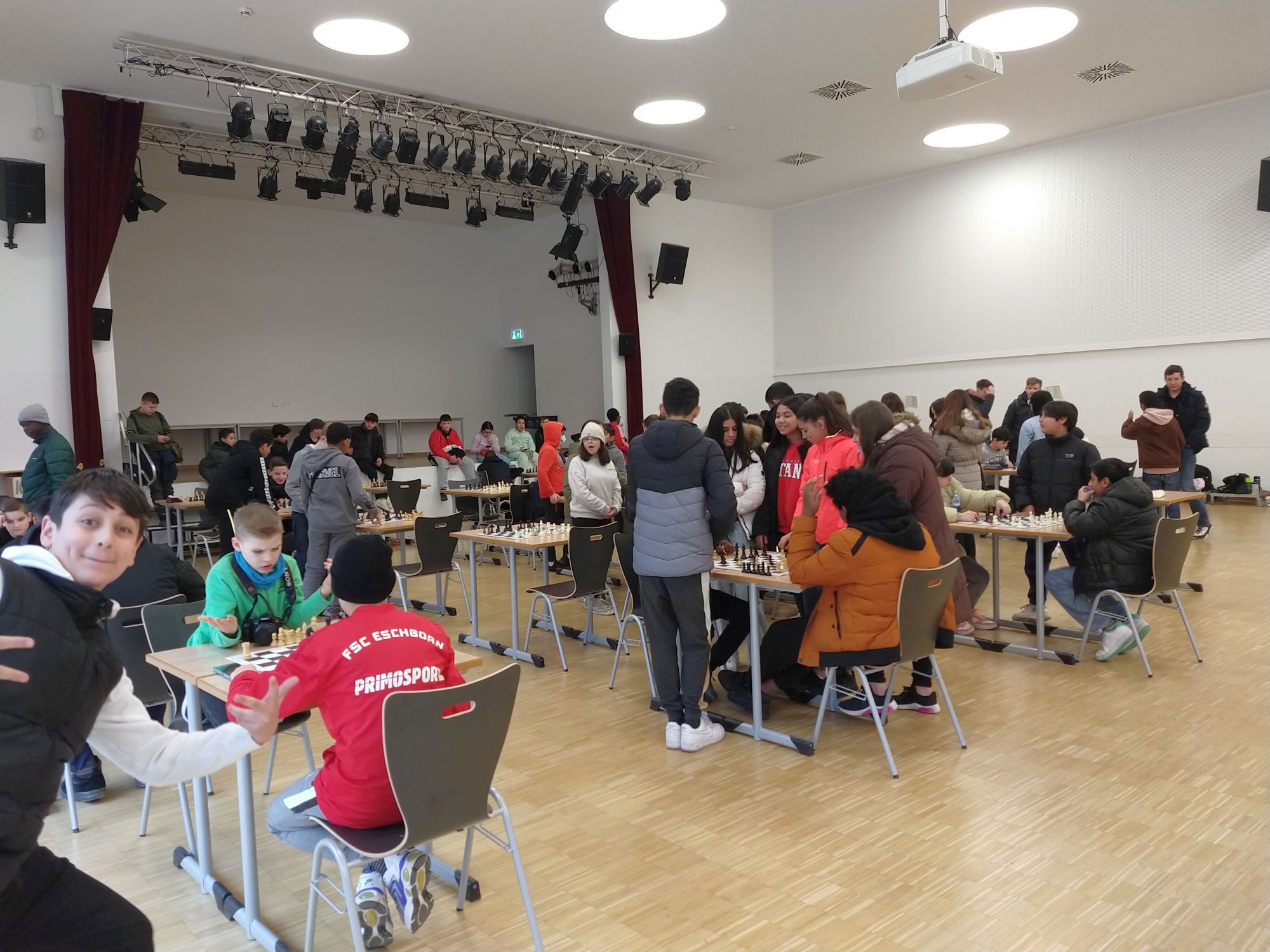 Premiere an der IGS-West: Erstmals in der Geschichte der Höchster Schule veranstaltete der WPU-Kurs „Soziales Engagement“, geleitet von Frau Wember, in Zusammenarbeit mit dem Oase-Team ein großes Schachturnier in der Aula der IGS-West.